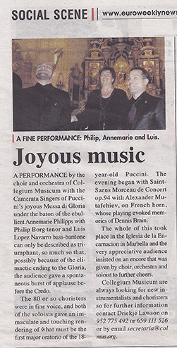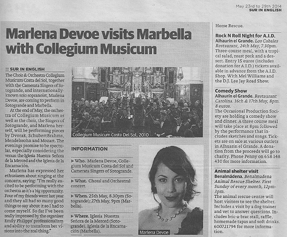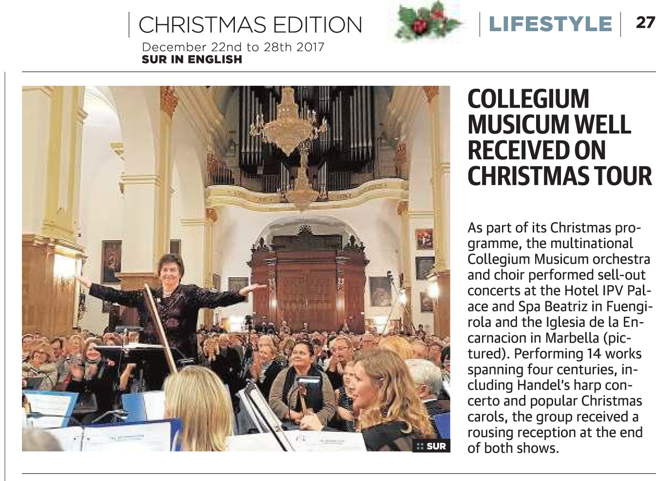 El coro y la orquesta «Collegium Musicum» Costa del Sol fue fundado en 1975 por unos pocos amantes de la música que se asentaron en la Costa del Sol y que ha crecido año a año. El objetivo es enriquecer la vida de la comunidad internacional de la Costa del Sol a través del disfrute de hacer y escuchar la buena música.